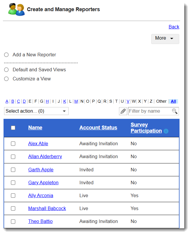 Above the table that displays your reporters’ names, you’ll see letters of the alphabet.