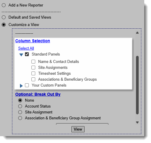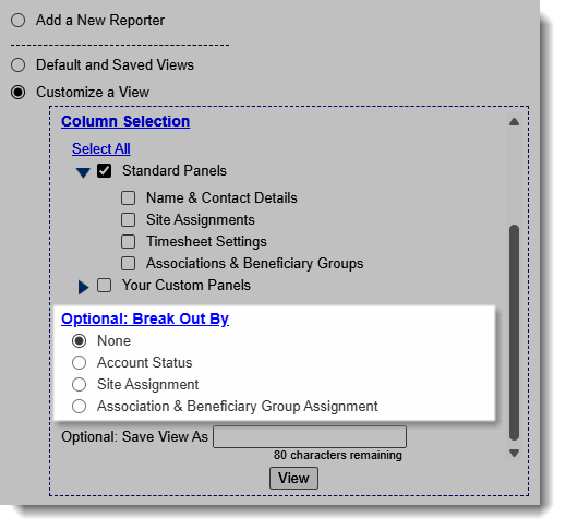 - From here you can create break outs based on Account Status, Site Assignment or Association & Beneficiary Group Assignment.