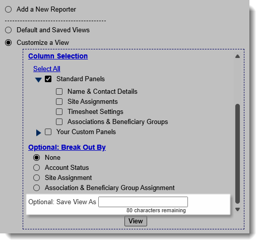 To Save View As for easy access later on in the “Default and Saved Views” section, please enter a name for it in the text field at the bottom of this box.