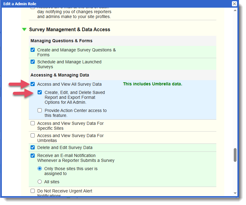 - Admins who will be able to save selections and export options will need to have the permission "Access and View All Survey Data" AND the new permission "Create, Edit, and Delete Saved Report and Export Format Options for All Admin."