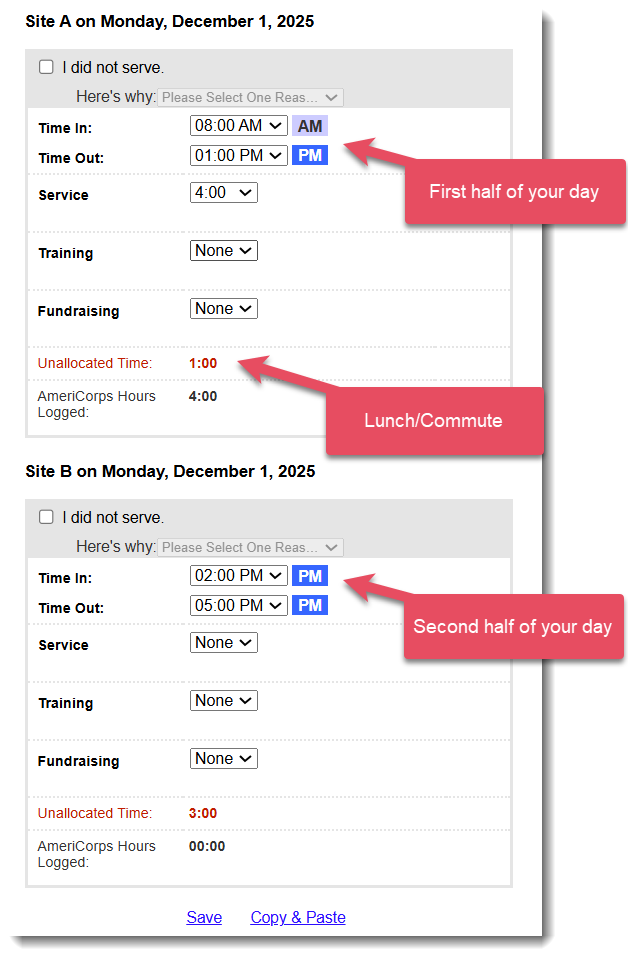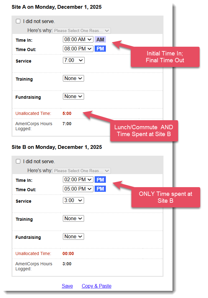 - For Site B, you will only enter the hours you served there. (Ask your supervisor where you should account for lunch or breaks, if applicable, and if you can count commute time between the two sites.)