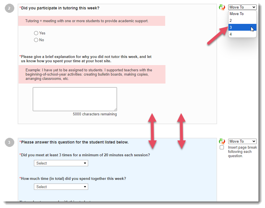 To order questions, either select a question and drag it to its desired location, OR select the location using the Move To drop-down menu to the right of each question.