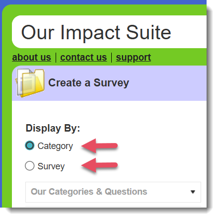 Use the Display By option to choose how your questions are organized in this space by clicking either Category or Survey option. - To add a question to your new form, click the Add Question checkbox alongside the question.