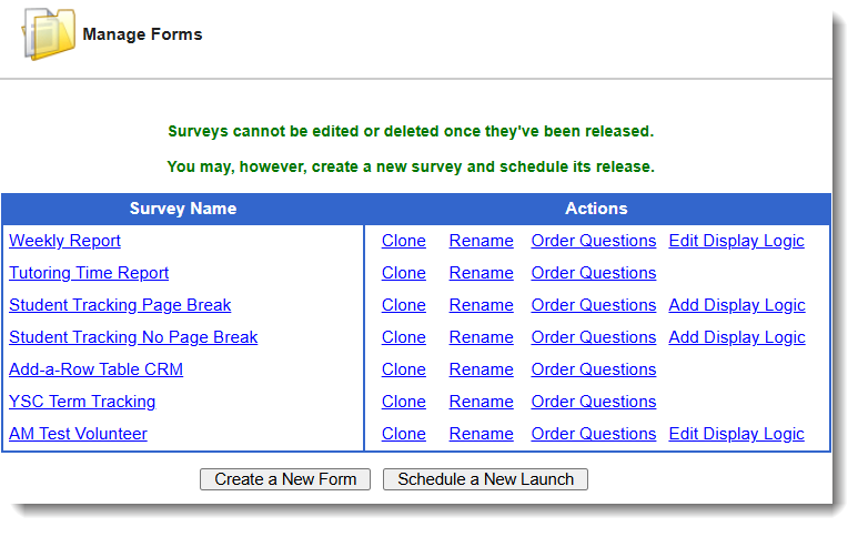 | Clone | This option allows you to create a clone of the form (you can add, subtract, and re-order questions). |