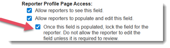 TO RESTRICT OVERWRITE: Give reporters the ability to edit fields on their profile page, then check the box next to “Once this field is populated, lock the field for the reporter. Do not allow the reporter to edit the field unless it is required to review."