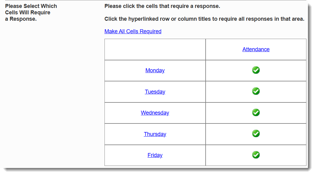 - Once you are done editing the rows and columns, tell the Impact Suite which cells in the matrix are required. Either use the Make All Cells Required link or click the specific cells that will be required.