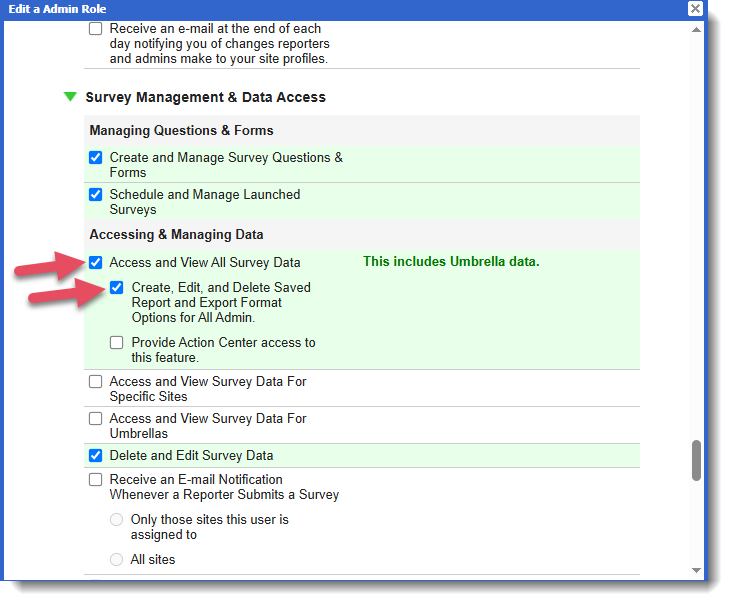 - Admins who will be able to save selections and export options will need to have the permission "Access and View All Survey Data" AND the new permission "Create, Edit, and Delete Saved Report and Export Format Options for All Admin."