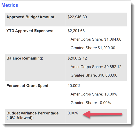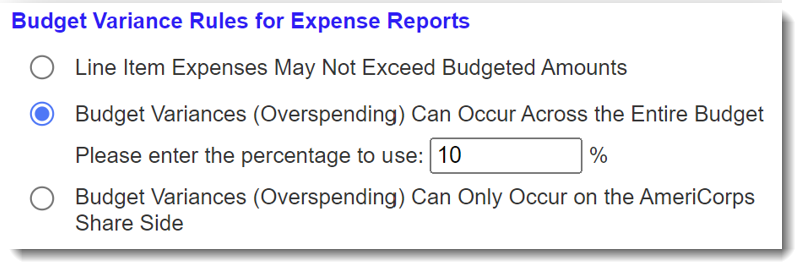 Subgrantees can enter expenses beyond what was budgeted, up to a specific percentage of the total budget that you'll set. - Budget Variances (Overspending) Can Only Occur on the AmeriCorps Share Side