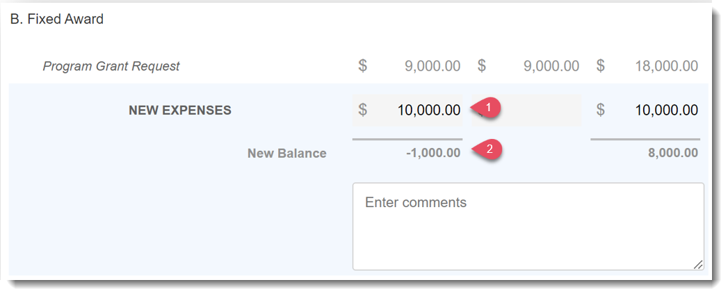 When programs enter expenses that exceed funds remaining for any one line item, they’ll see a negative total for that line item.