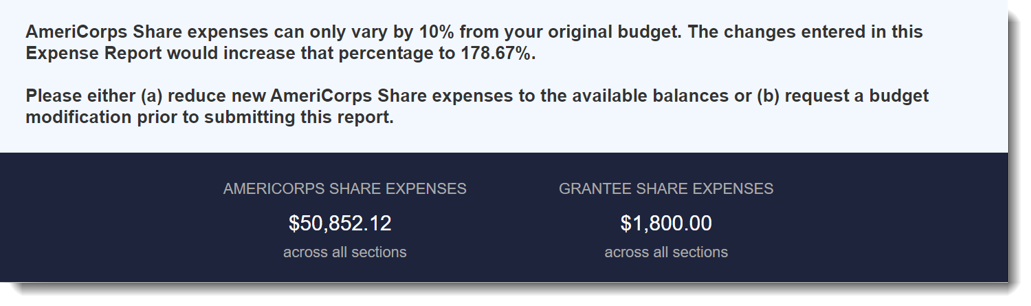 Subgrantees can enter expenses beyond what was budgeted, up to a specific percentage of the AmeriCorps Share budget that you'll set.