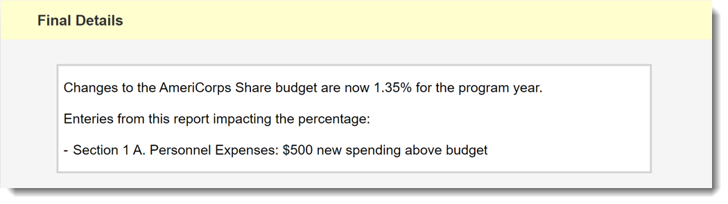 In the Final Details section of the report, programs will see what their total variance amount will be for the year once the report is approved. They’ll also see a list of line items in the current report impacting this percentage.