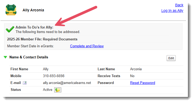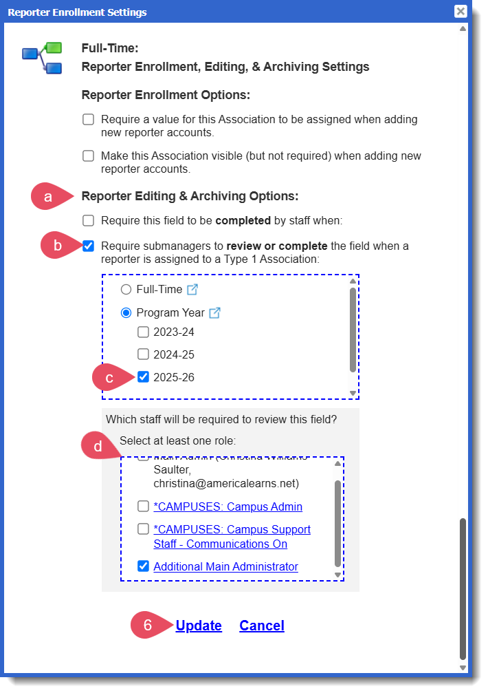 The relevant admins will be prompted to review the field when the reporter is added to the Type 1 Association Item: 2025-26 (under Program Year) in their profile. Here's how admins will be prompted: