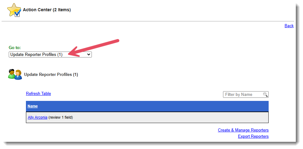 - All selected admins will have access to a new page on their Action Center: Update Reporter Profiles listing all reporters with fields that need to be reviewed: