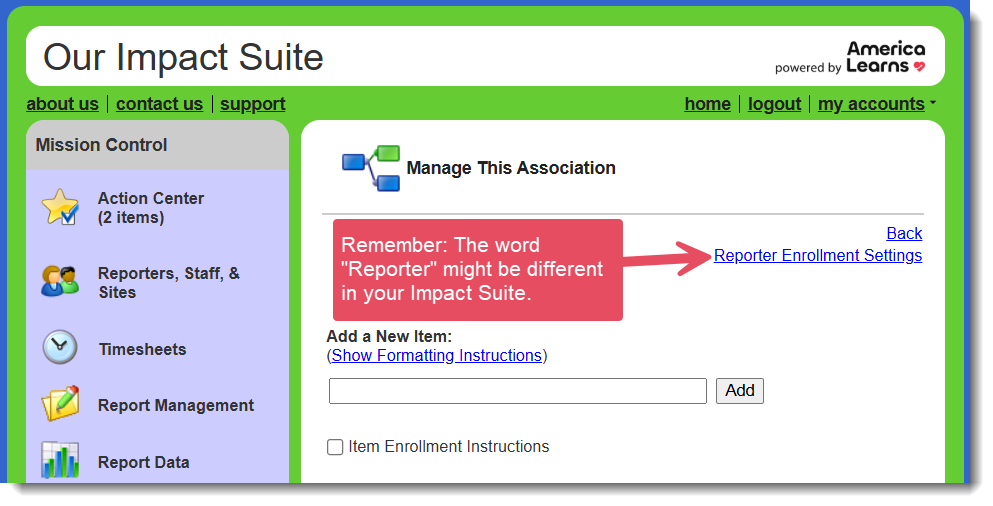 - On the right, use the Reporter Enrollment Settings link. A window will open.