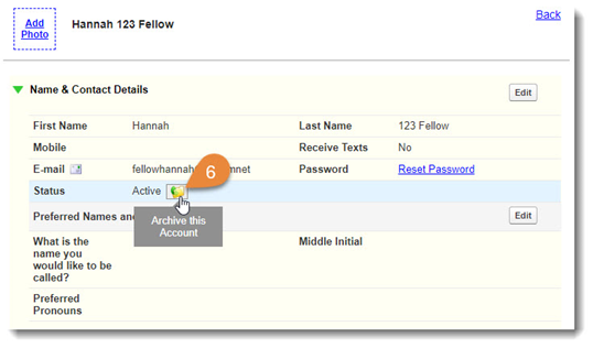 Status Definition Early Exit - No Education Award Served fewer than 300 hours and did not complete the program. Early Exit - Compelling Personal Circumstance Member exited the program due to serious illness, death of an immediate family member, etc. Conditions outside of the Member's control. Successfully Completed - Earned Education Award Fellow served through the end of the program date and completed a minimum of 300 hours. - Scroll up to the Name & Contact Details panel. Hover over the Status icon and select Archive this Account.