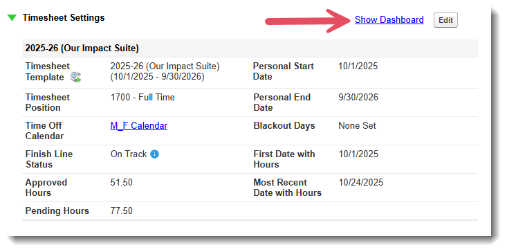 Importantly, you can access each individual's Timesheet Dashboard by clicking the Show Dashboard link here.