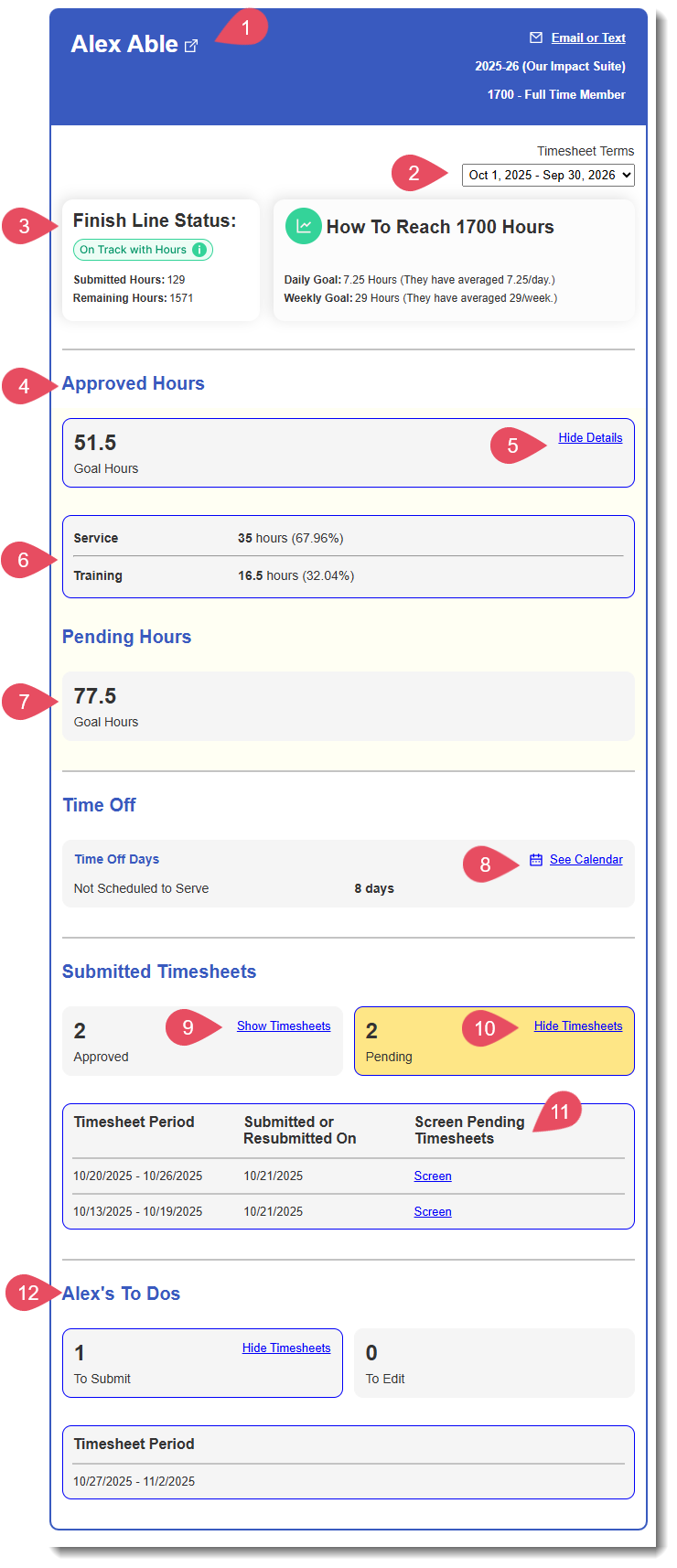 | 4) Approved Hours | This section shows the number of Goal Hours completed and approved to date. |
