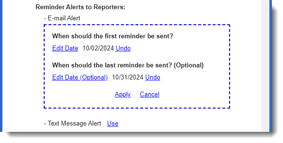 - Next, if you have turned on "Allow reporters to edit this field on their profile page..." decide if you would like add Reminder Alerts to Reporters.