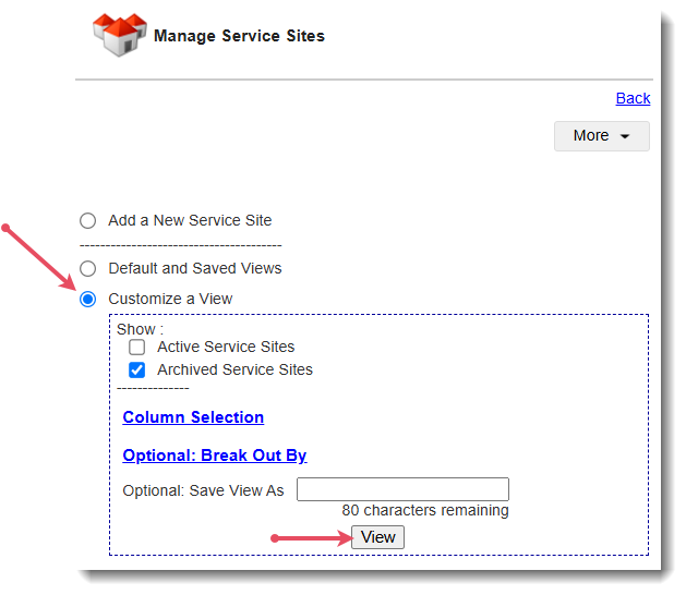 - Use the Customize a View option to select Archived Service Sites and click View.