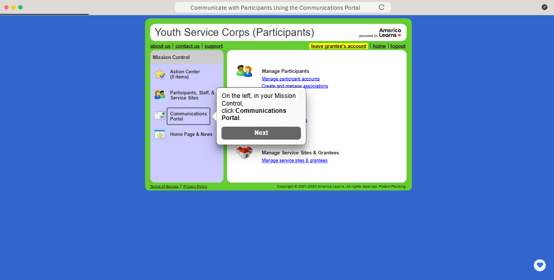 - On the left, in your Mission Control, click Communications Portal.