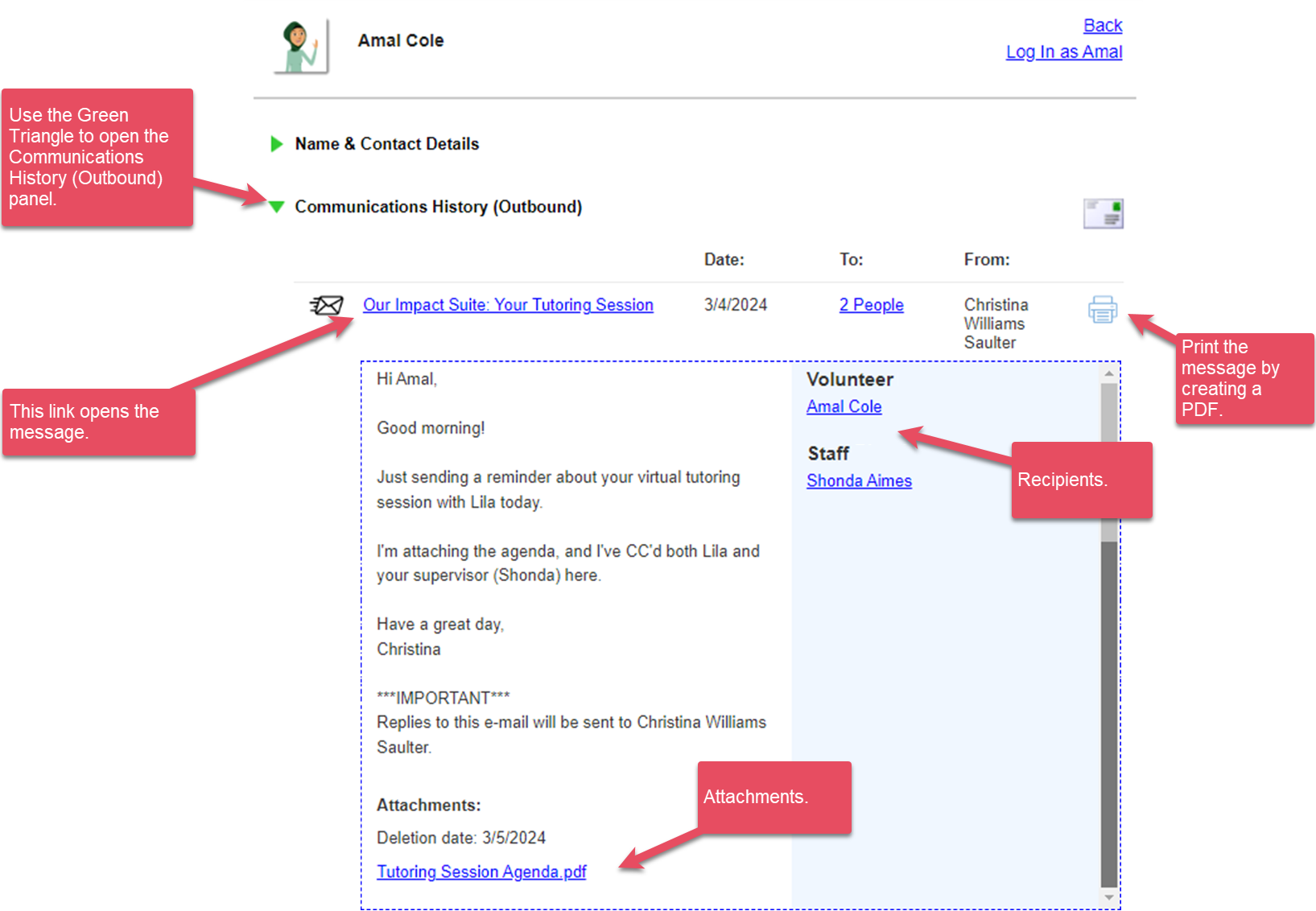 - Scroll to the Communications History (Outbound) panel and click to open it.