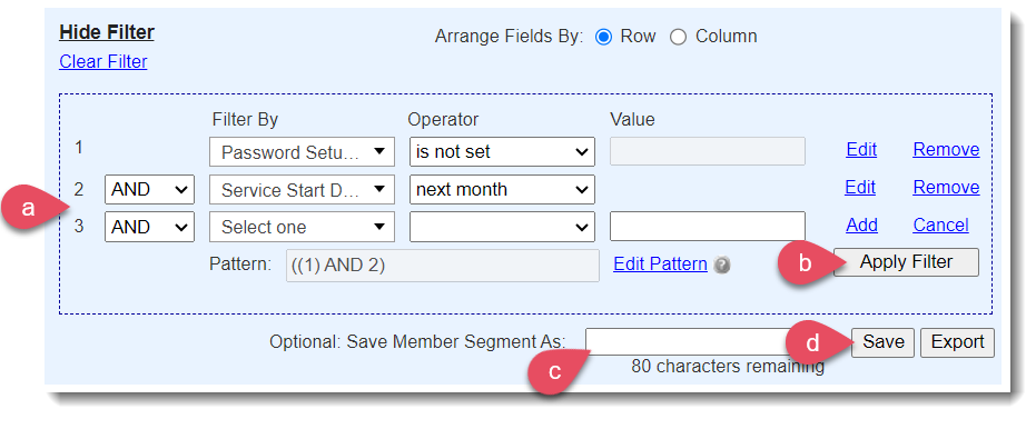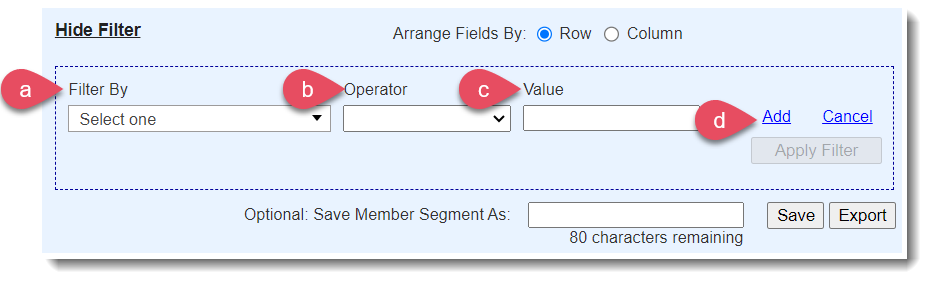 - Choose a (a) Filter By option, select an (b) Operator, and (if relevant) a (c) Value, then click (d) Add.