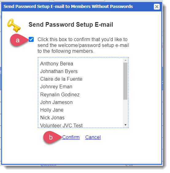 (a) Check the box and click (b) Confirm to send the Password Setup Email.