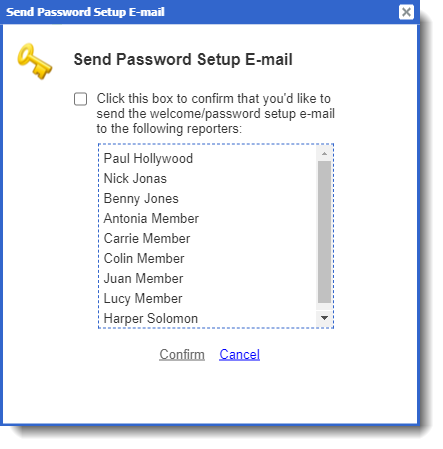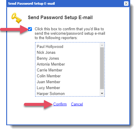 - To send the Welcome/Password Setup Email, check the box and click Confirm.