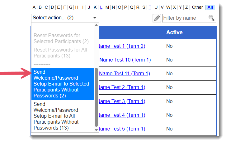 - In the table, use the Select action drop-down menu and select the Send Welcome/Password Setup E-mail to All Participants without Password (#).