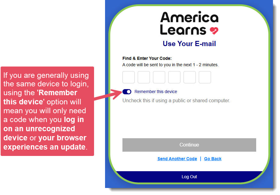 Remember this device: If you check this option when entering your code, you won’t be asked for a code every time on that device. You’ll only need a code again if something changes (new browser, update, etc.).