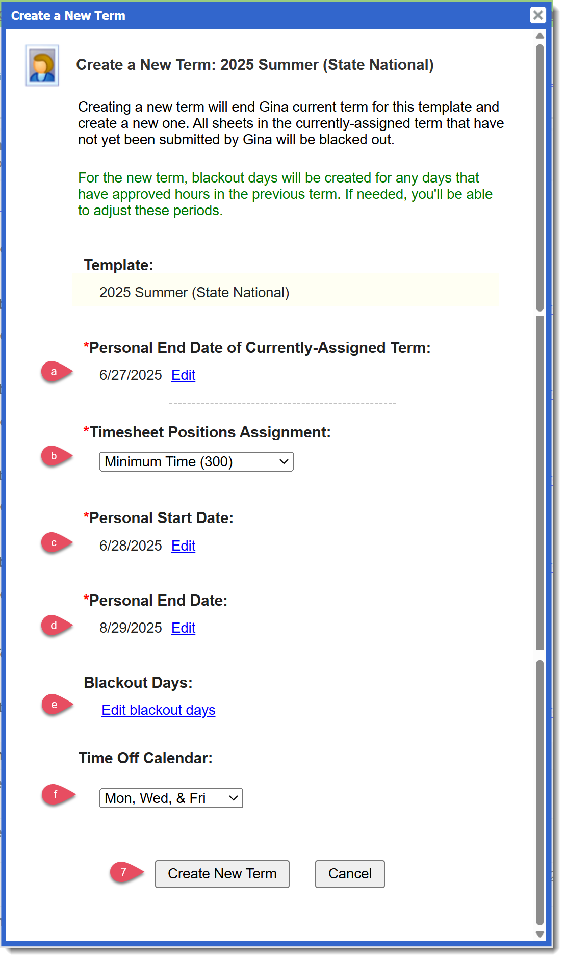 - Timesheet Positions Assignment: If the reporter has a new Timesheet Position for this new Term, it should be adjusted here.