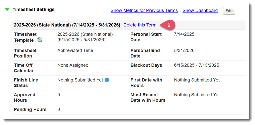 If you created a term in error, you can delete it as long as there is no approved time within that term. The Reporter will return to their previous term, but you will need to review and adjust blackout dates after the adjustment. Here are steps to delete: