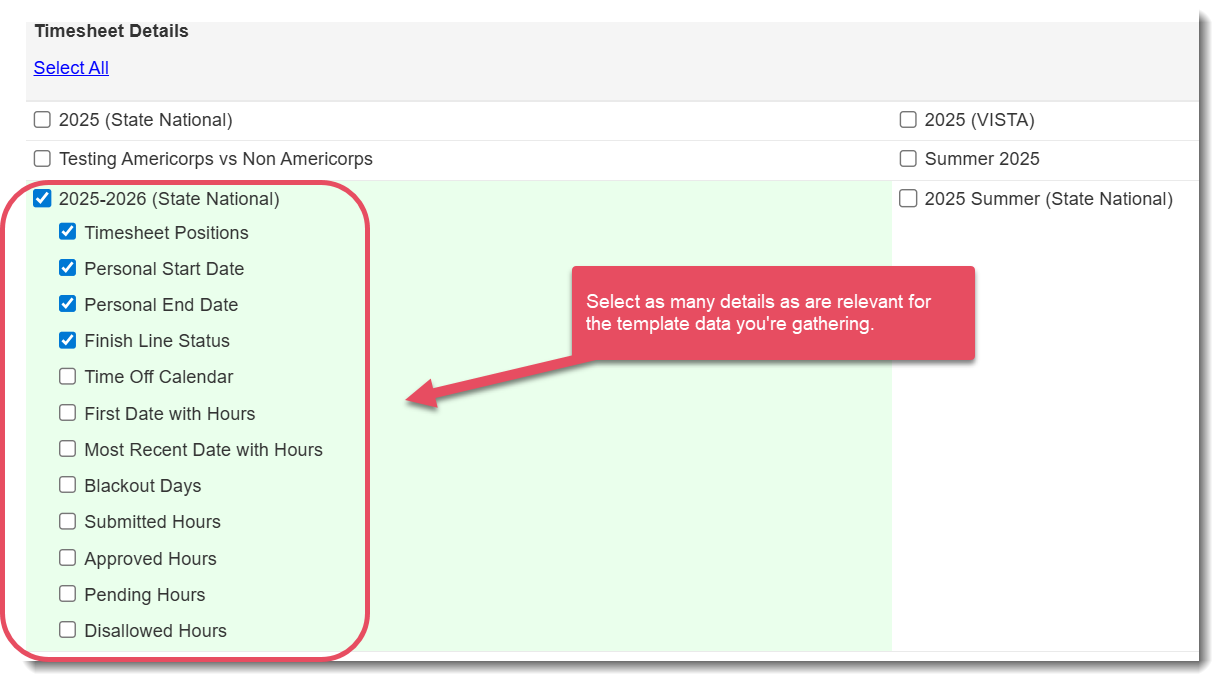 - Select any timesheet data you'd like to view across all terms in a timesheet template.