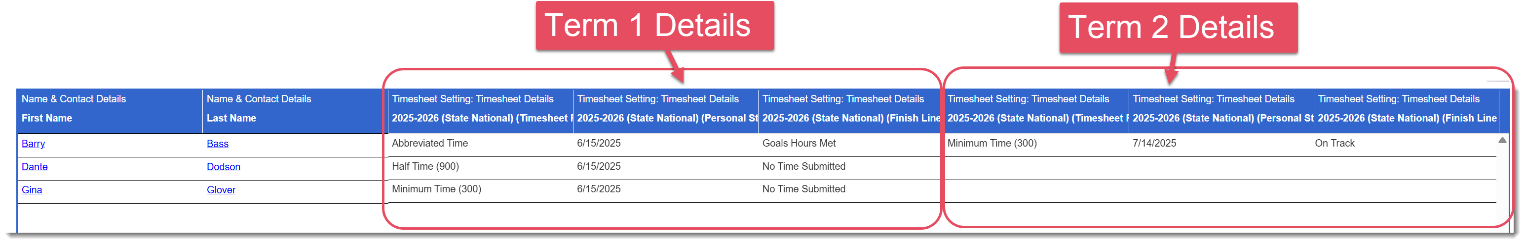 Example: In the scenario below, Barry Bass is the only Reporter who has completed a second term. Their Term 2 details are visible, while those columns are blank for the other Reporters assigned to that timesheet template.
