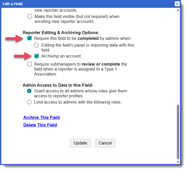 - Under Reporter Editing & Archiving Options, uncheck both the boxes labeled (1) Require this field to be completed by admins when AND (2) archiving an account.