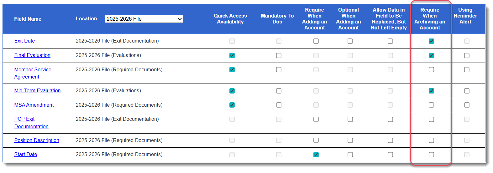 - In the table, use the checkboxes under the column Require when Archiving an Account to quickly update the field settings. Your changes will be saved automatically.