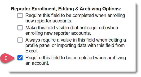 - Under Reporter Enrollment, Editing, & Archiving Options, uncheck the box labeled Require this field to be completed when archiving an account.